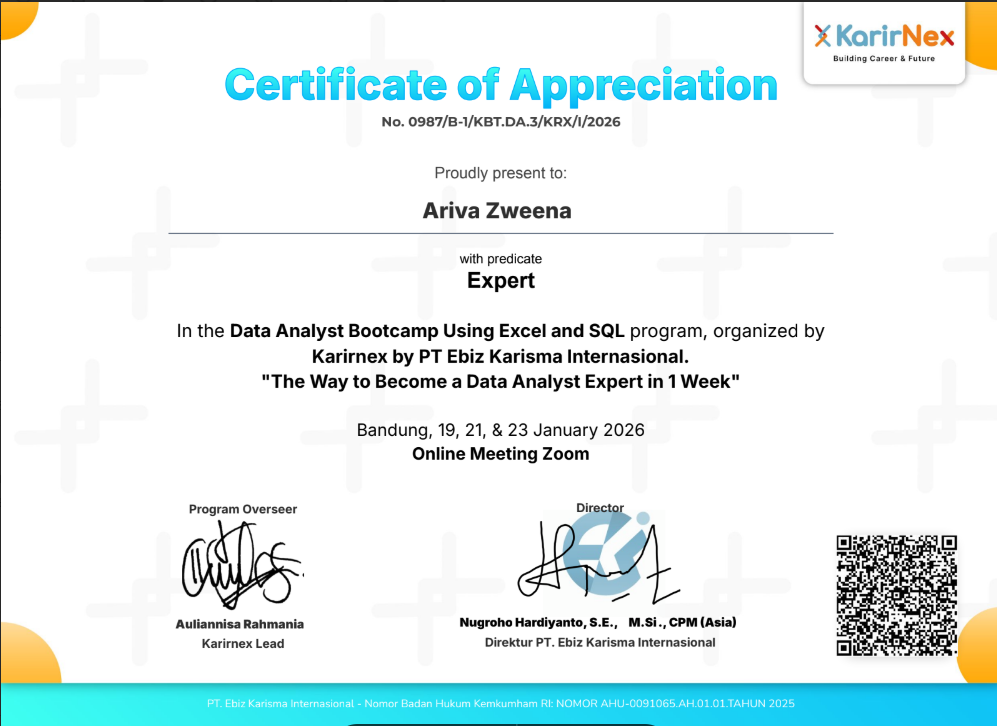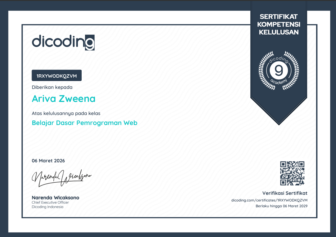 Ariva ZweenaDiploma IV Information Technology student with interests in Full Stack Development and Data Analysis. Experienced in frontend development using Bootstrap and Tailwind CSS, backend development with Laravel, and database management with MySQL using tools like TablePlus.