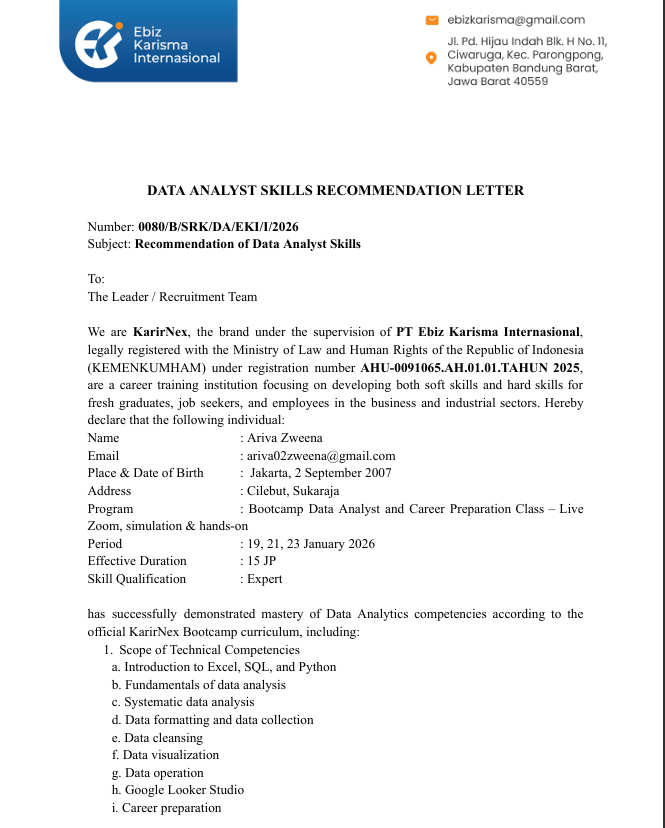 In addition to web development, I have developed skills in data analysis through a data analyst bootcamp, where I worked with Excel and SQL to process, analyze, and interpret data to generate meaningful insights. This experience is supported by a recommendation letter from the program.